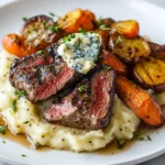 Grilled Grass Fed Skirt Steak & Celery Root Mash with Roasted Winter Vegetables & Blue Cheese Butter
