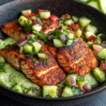 Crispy Pan-Fried Cajun Salmon with Fresh Avocado Sauce and Cucumber Salsa