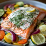 Falafel-Crusted Baked Salmon with Roasted Veggies & Tahini Sauce