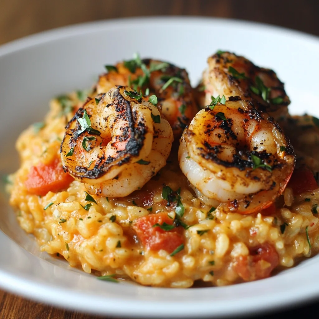 Blackened Shrimp & Cheddar-Pancetta Risotto features plump, seasoned shrimp atop a creamy risotto infused with rich cheddar and crispy pancetta. Drizzled with a vibrant tomato-herb sauce, this dish combines bold flavors with comforting textures for a truly indulgent experience.