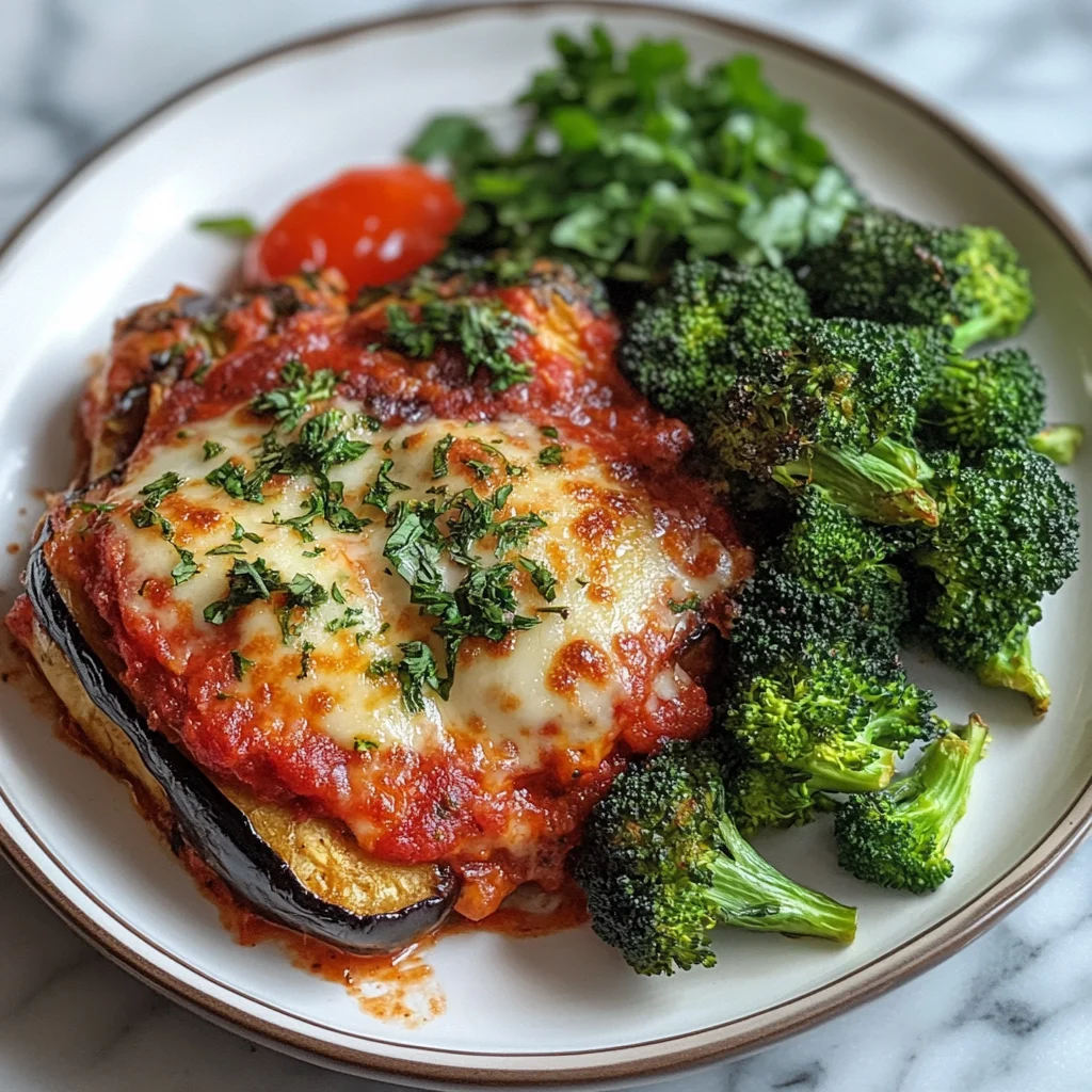 Eggplant Parmesan with garlic green broccoli is a delightful vegetarian dish that features layers of tender, baked or fried eggplant slices, generously topped with marinara sauce, and a blend of melted cheeses, creating a rich and comforting flavor profile. The eggplant is seasoned to perfection, offering a savory taste and a satisfying texture.