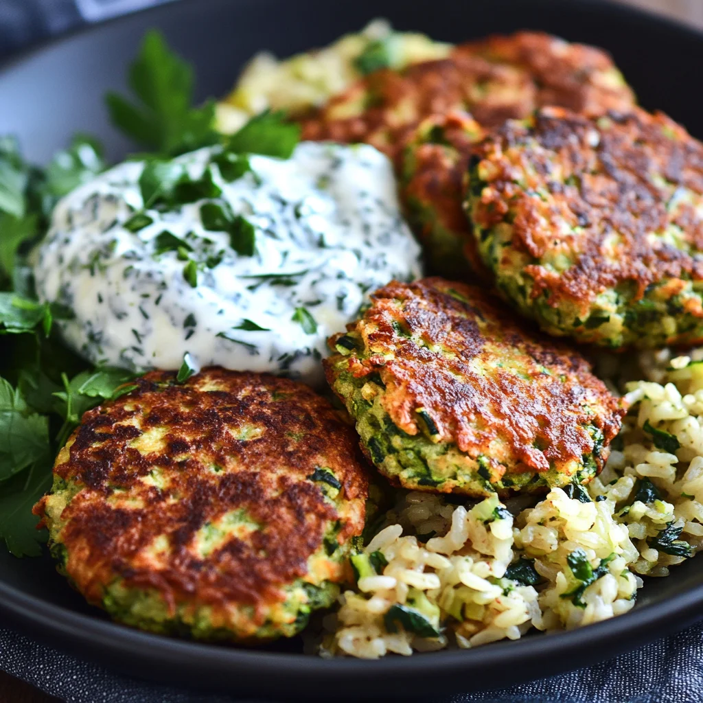 Mediterranean Zucchini Fritters are a delightful combination of grated zucchini, fresh spinach, and aromatic herbs, pan-fried to perfection for a crispy exterior and tender interior. Served alongside a flavorful rice pilaf and drizzled with a creamy herbed yogurt sauce, this dish offers a refreshing and satisfying meal that highlights the vibrant flavors of the Mediterranean.