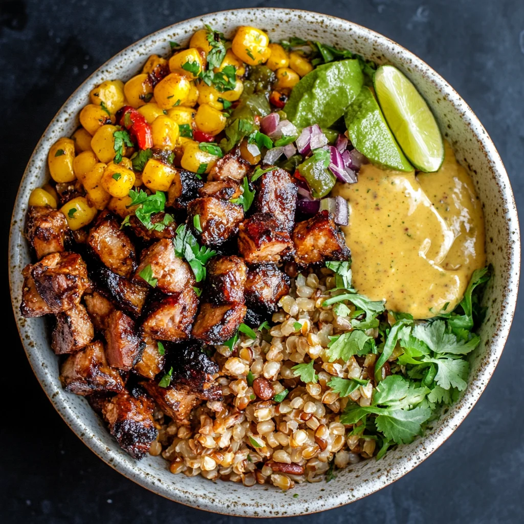 The Pork Al Pastor Grain Bowl features tender, marinated pork served over a base of hearty grains and topped with fresh vegetables and a zesty agave-lime vinaigrette. This vibrant dish combines bold flavors with a nutritious profile, making it a satisfying and wholesome meal option.