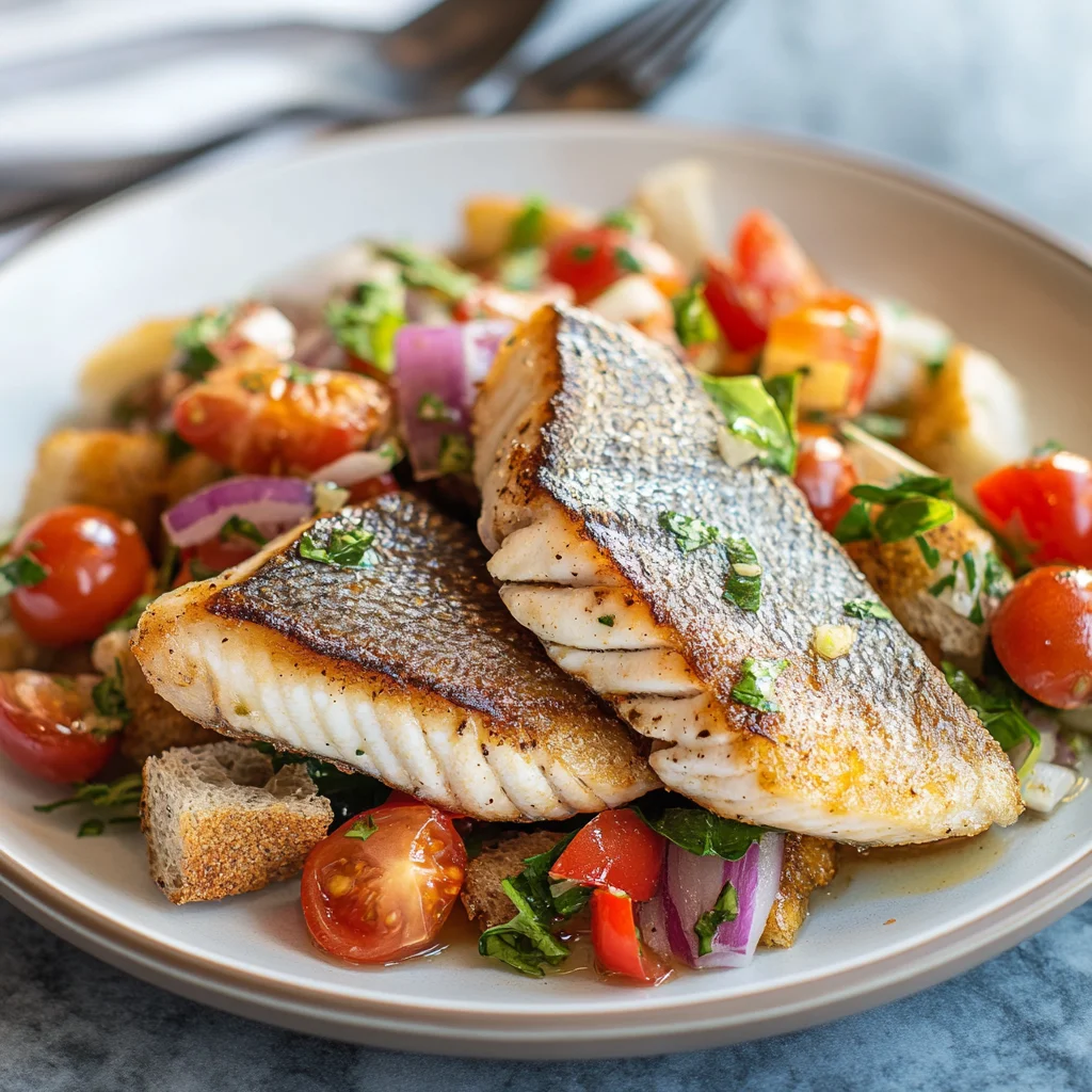 Seared Branzino with Panzanella Salad & Red Wine Vinaigrette