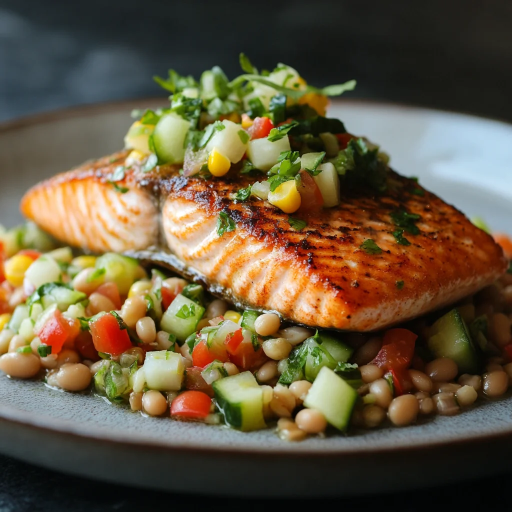 Seared Salmon over Farro & White Bean Salad features perfectly cooked salmon resting on a hearty bed of farro and white beans, complemented by a refreshing jicama-corn salsa. Drizzled with a zesty cucumber-cilantro sauce, this dish offers a delightful blend of textures and flavors that nourish the palate.
