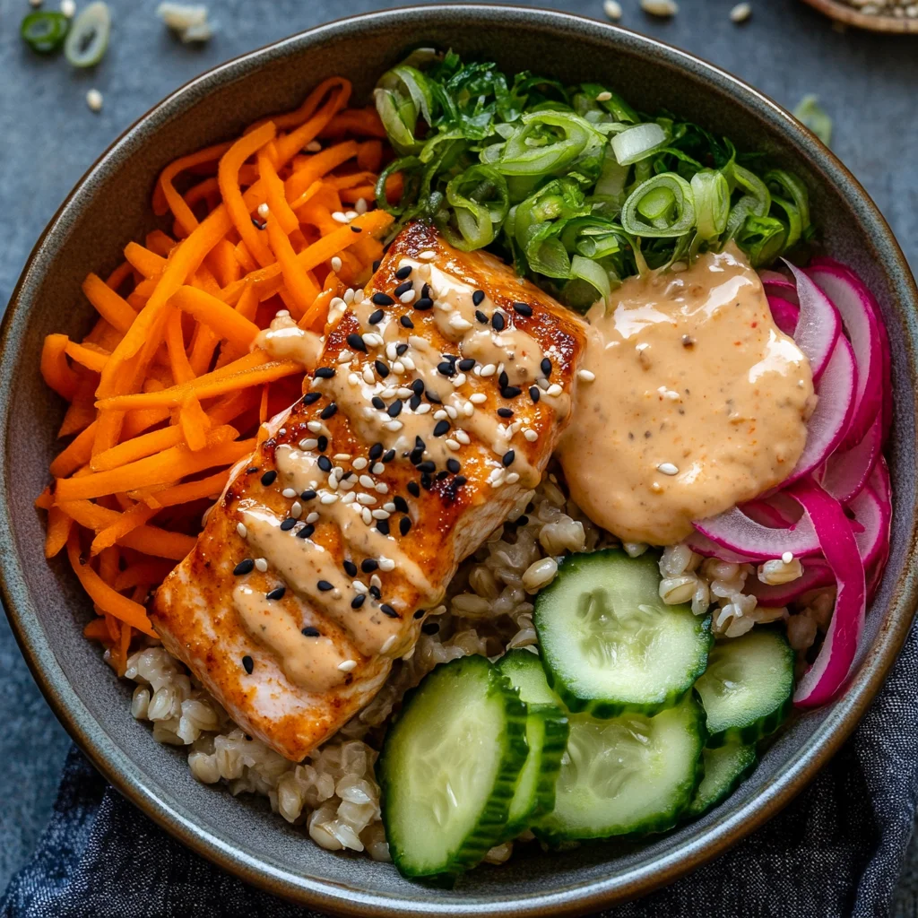 Sesame Salmon & Barley Bowl features tender salmon glazed with sesame sauce, served over a hearty barley base and topped with vibrant pickled vegetables. Drizzled with spicy mayo, this bowl combines nutty flavors and fresh textures for a deliciously satisfying meal.