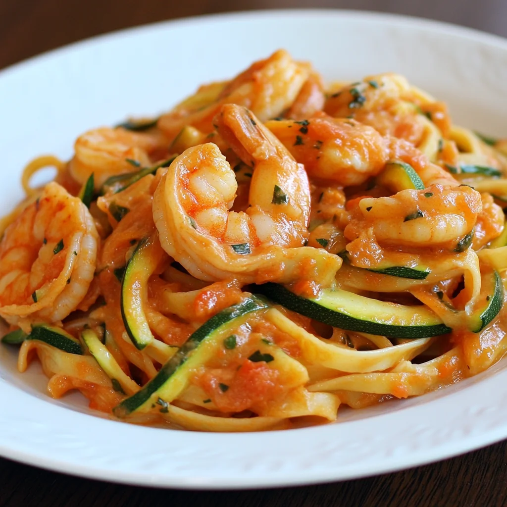 Shrimp and Zucchini Linguine features succulent shrimp and tender zucchini tossed with al dente linguine in a creamy roasted red pepper sauce. This dish combines fresh ingredients and bold flavors for a delightful and satisfying meal.