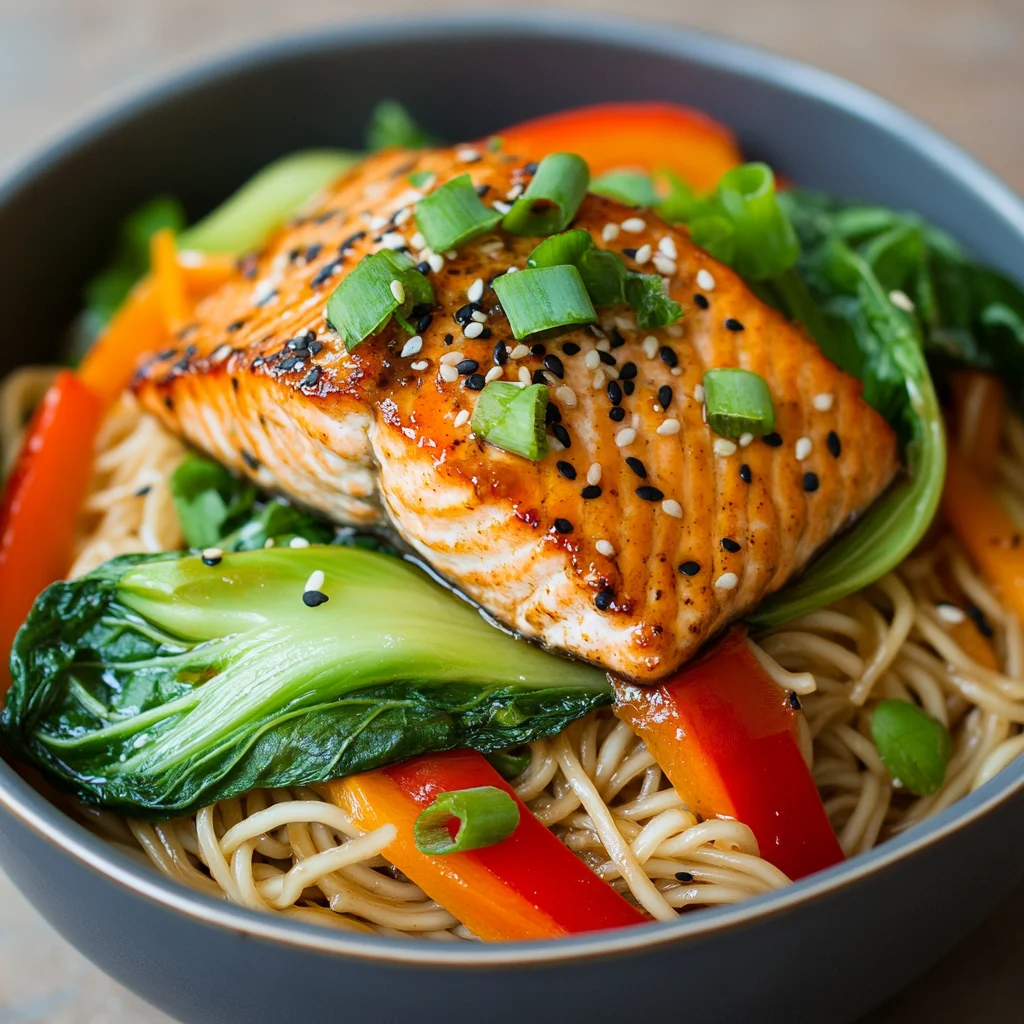 The dish includes salmon fillets, soy sauce, ginger, garlic, noodles (such as soba or rice noodles), a variety of Asian vegetables (like bell peppers, bok choy, and carrots), sesame oil, and green onions.