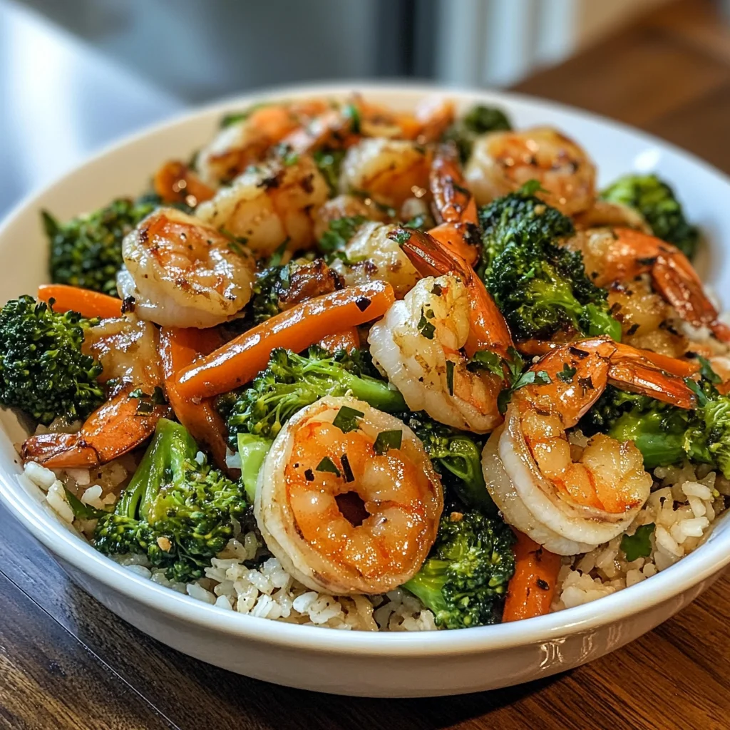 Stir Fry Shrimp & Broccoli features succulent shrimp sautéed with crisp broccoli and vibrant carrots, all tossed in a savory sauce. Served over fluffy Calrose rice, this dish offers a quick and satisfying meal packed with flavor and nutrition.