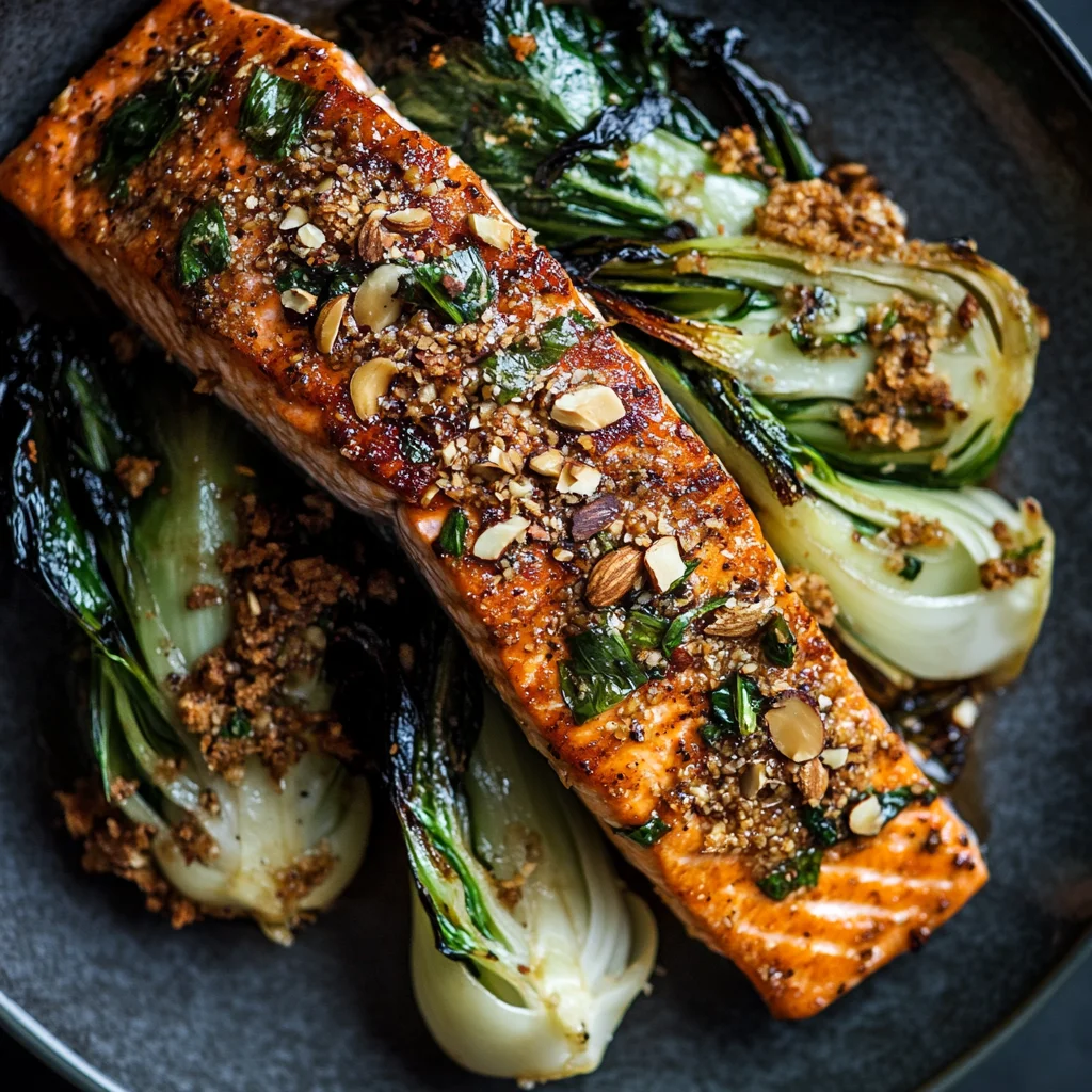 Walnut Miso-Crusted Salmon features tender salmon fillets coated with a rich miso and walnut crust, delivering a delightful crunch and umami flavor. Served with charred napa cabbage and bok choy, this dish offers a harmonious blend of textures and tastes that is both nutritious and satisfying.