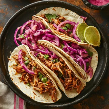 Adobo Pulled Pork Tacos with Cabbage Slaw & Pickled Onions